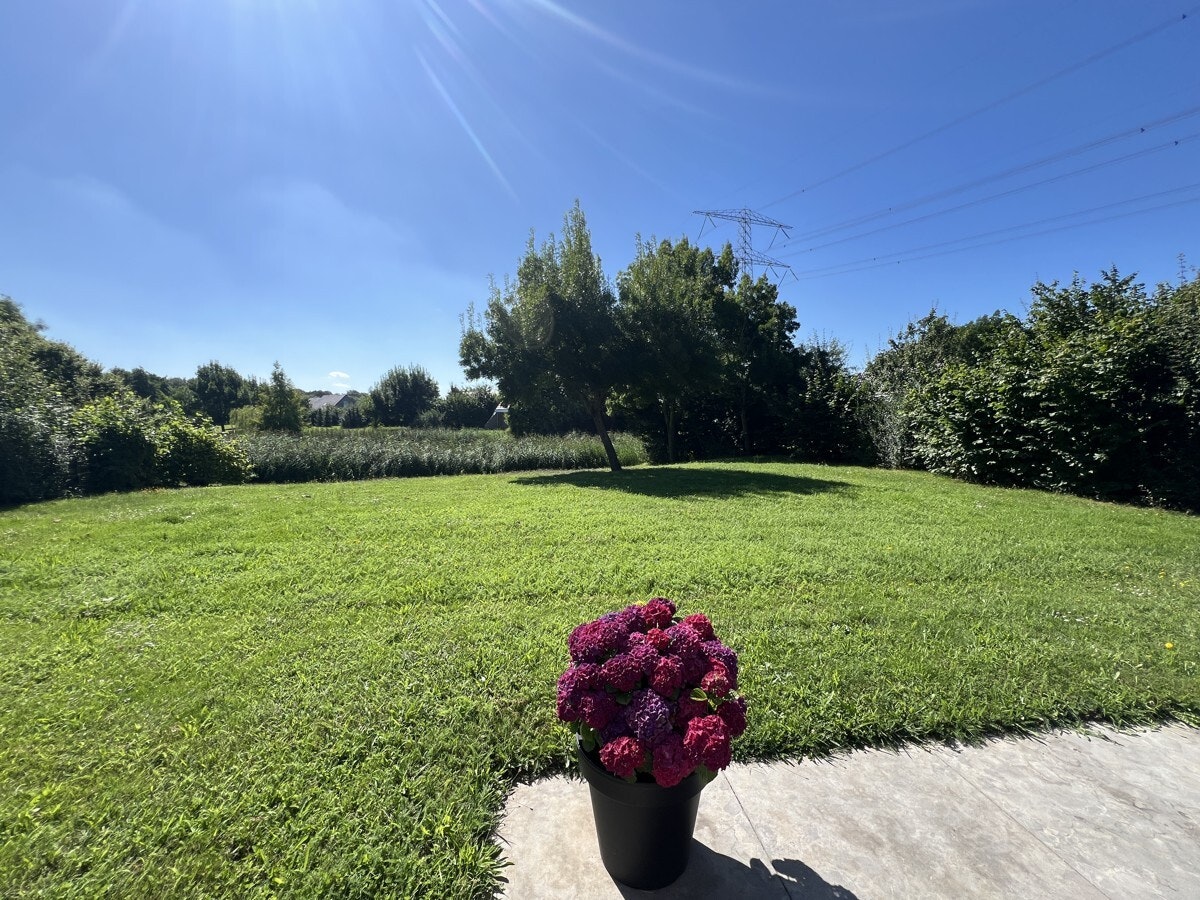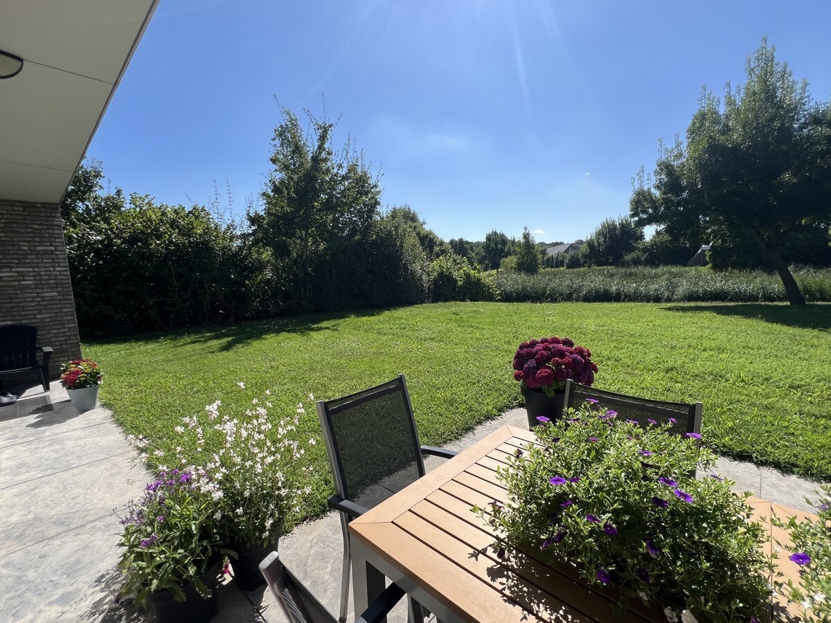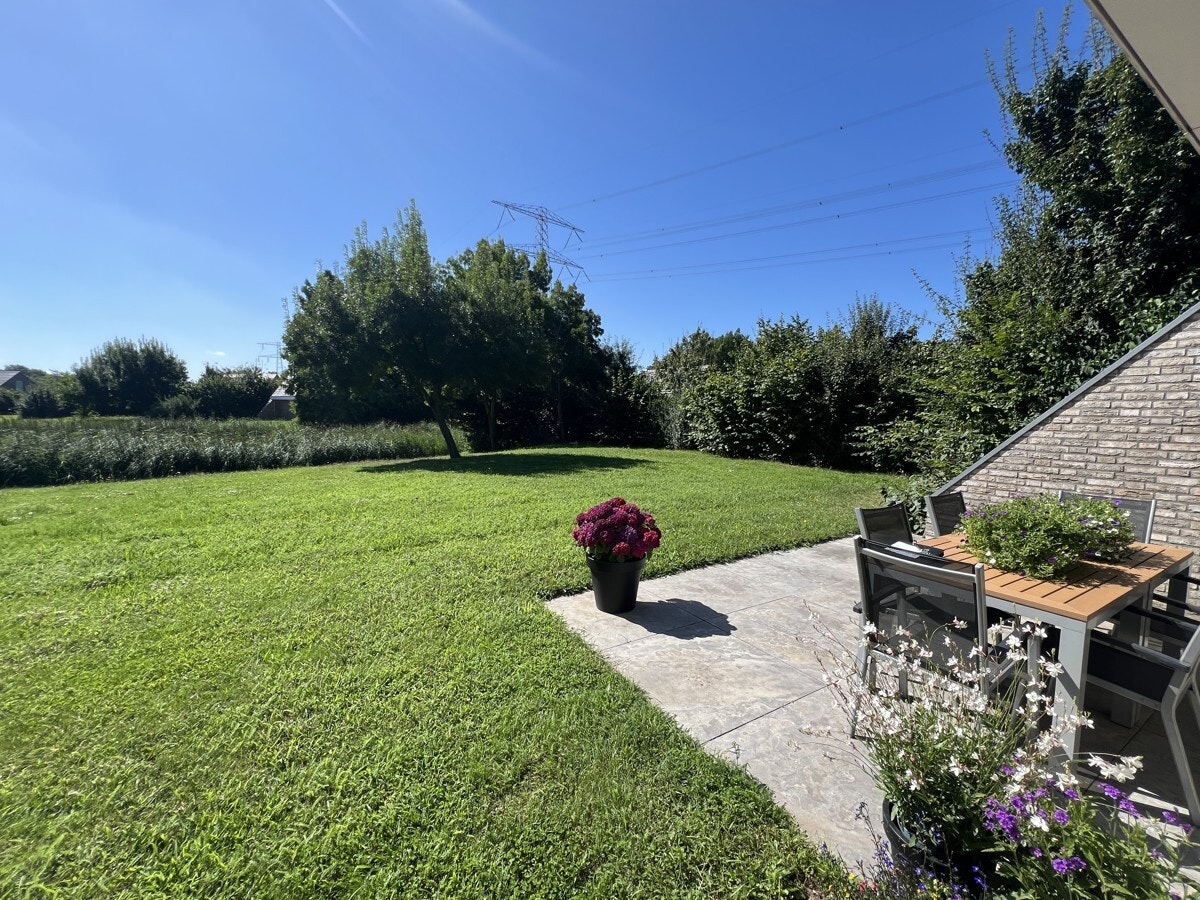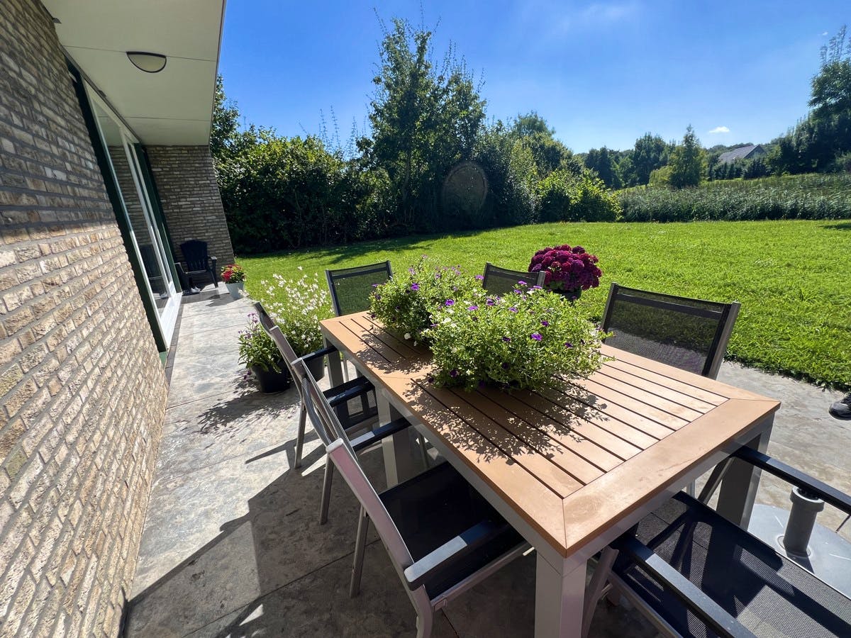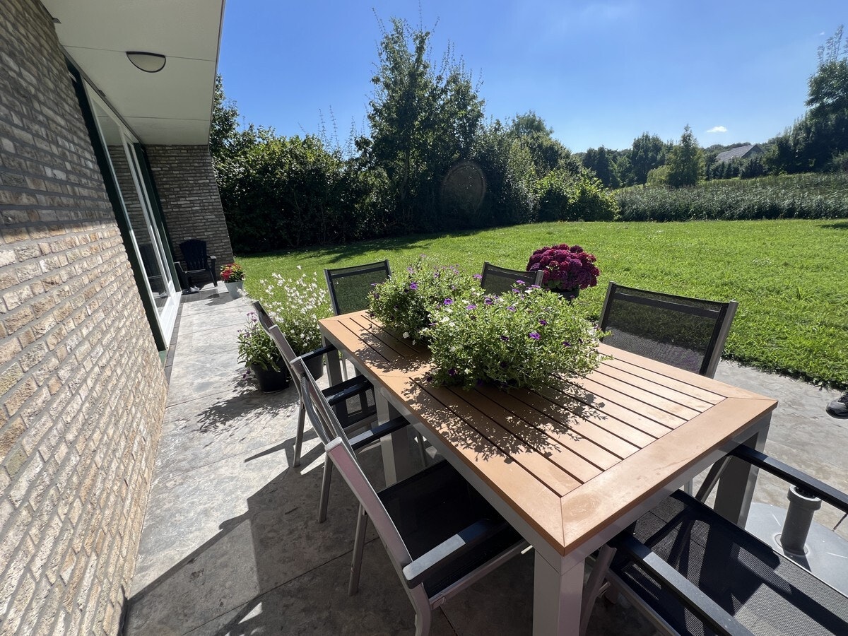 - Vom Wohnzimmer aus führt eine Terrassentür auf eine große Gartenterrasse. Gartenmöbel auf der