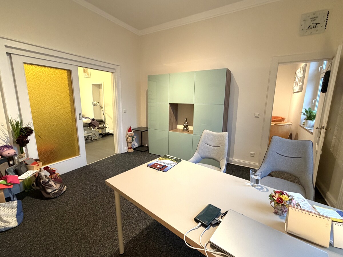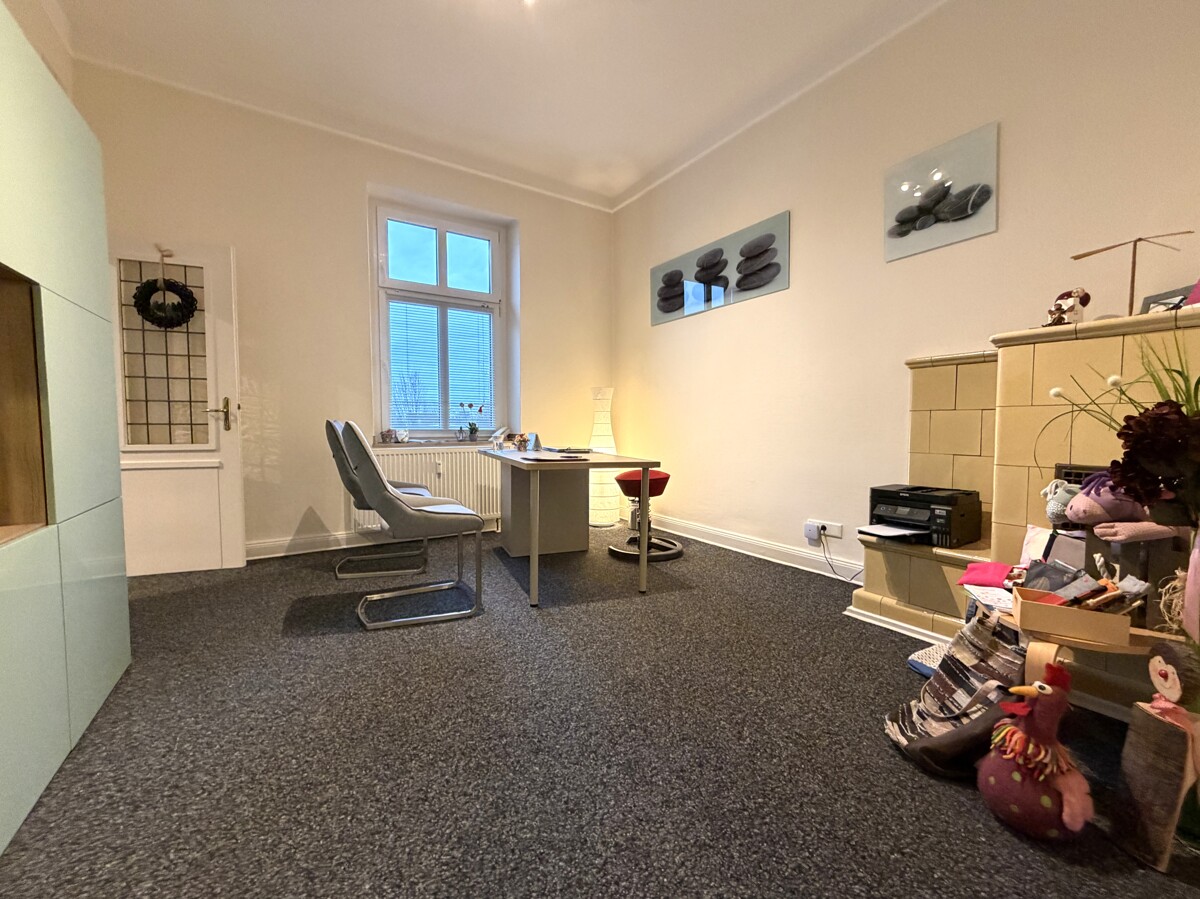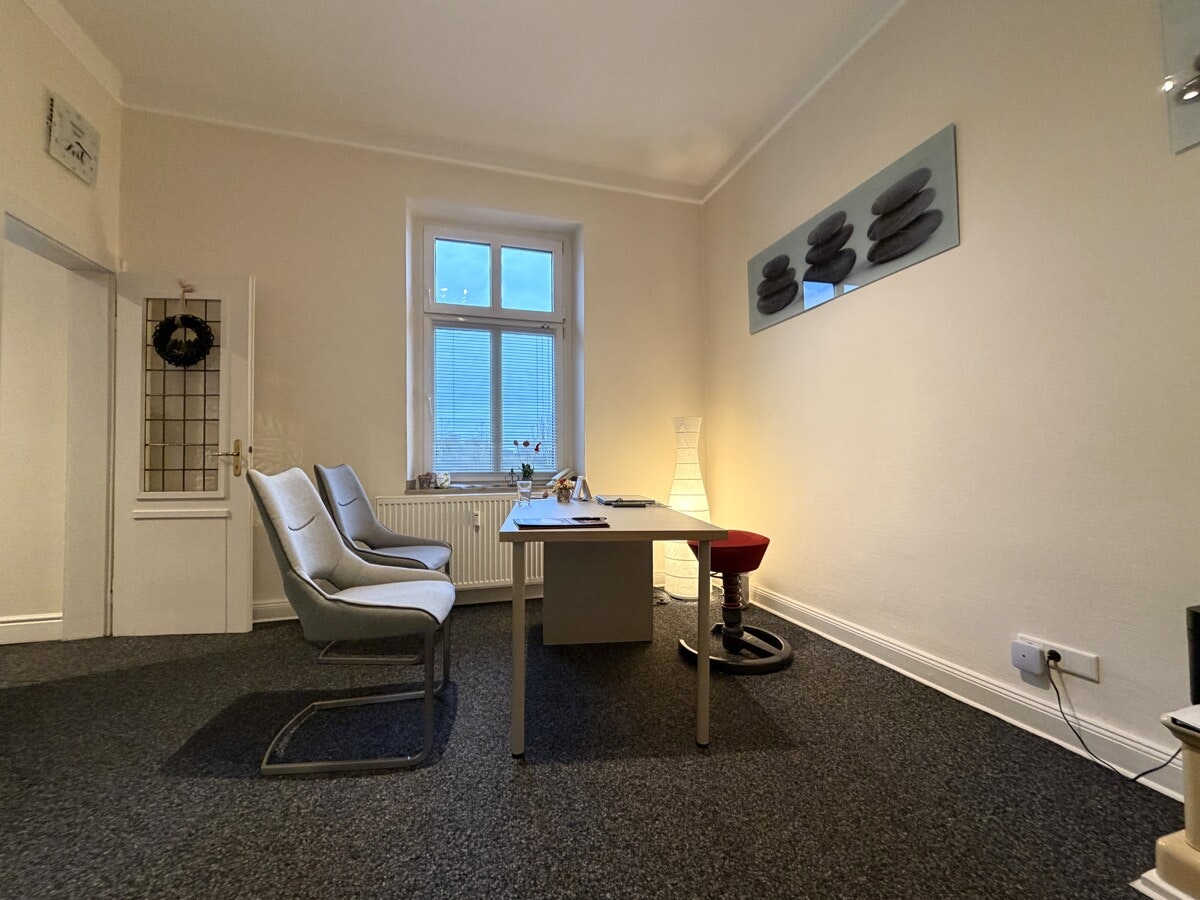 Die Gewerbeeinheit befindet sich in der 1. Etage eines gepflegten Mehrfamilienhauses, Baujahr ca. 1900, und wird seit mehreren Jahren als Heilpraktiker-Praxis genutzt. Sie betreten die Fläche über die Küche, von hier aus gelangen Sie in die beiden anderen Räume und das Bad. Der jetzige Behandlungsraum könnte jedoch auch vom Flur aus betreten werden - siehe Grundriss. Alle Zimmer sind mit einem Fenster ausgestattet, so dass genug Licht vorhanden ist. Die Fläche verfügt über ein Duschbad sowie ein separates Kunden-WC. Diese Räumlichkeiten eignen sich z.B. als Versicherungsbüro, Steuerberater, Rechtsanwälte, Pflegedienste, Heilpraktiker, o.ä.. Mehrere Parkflächen stehen gegen Gebühr zur Verfügung.