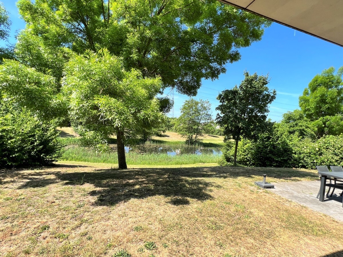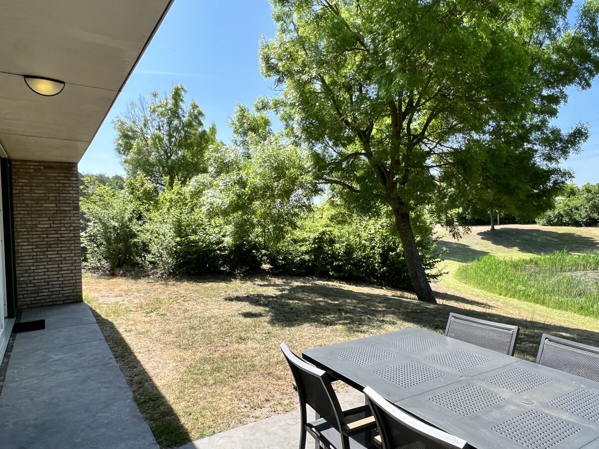- Vom Wohnzimmer aus führt eine Terrassentür auf eine große Gartenterrasse. Gartenmöbel auf der