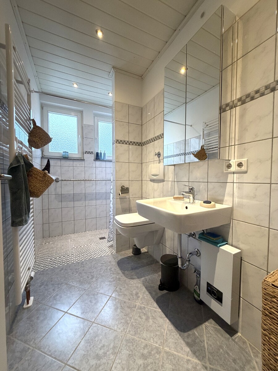 Das Tageslichtbad ist mit einer barrierefreien Dusche und Handtuchheizkörper ausgestattet.