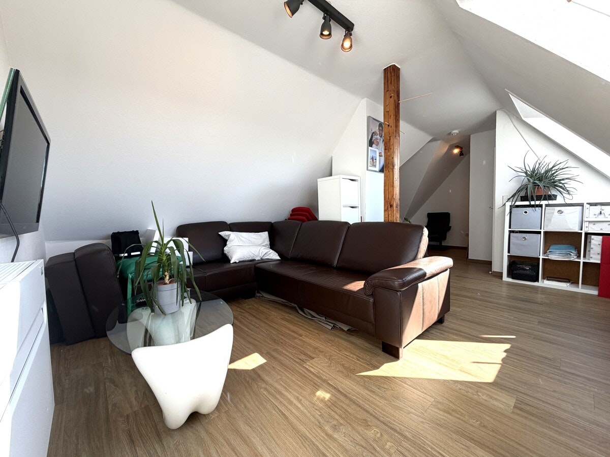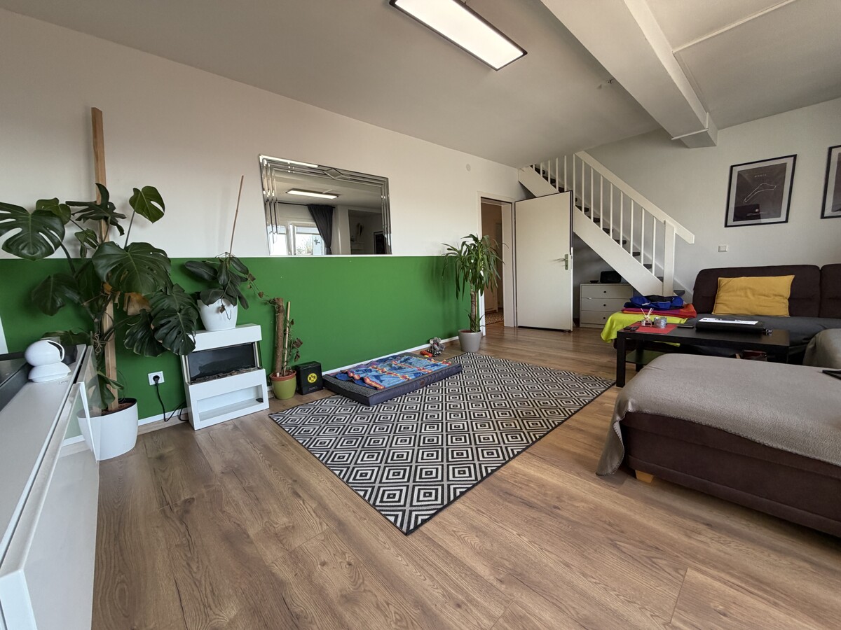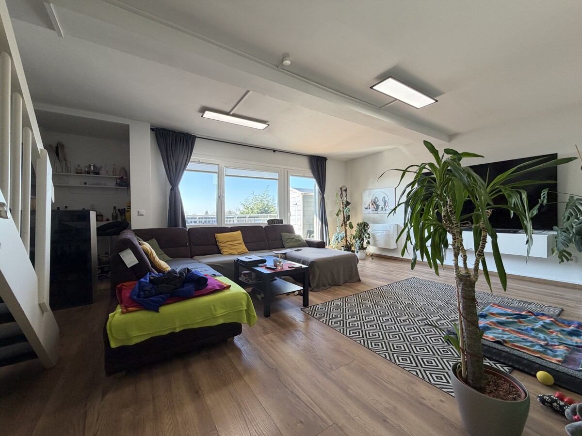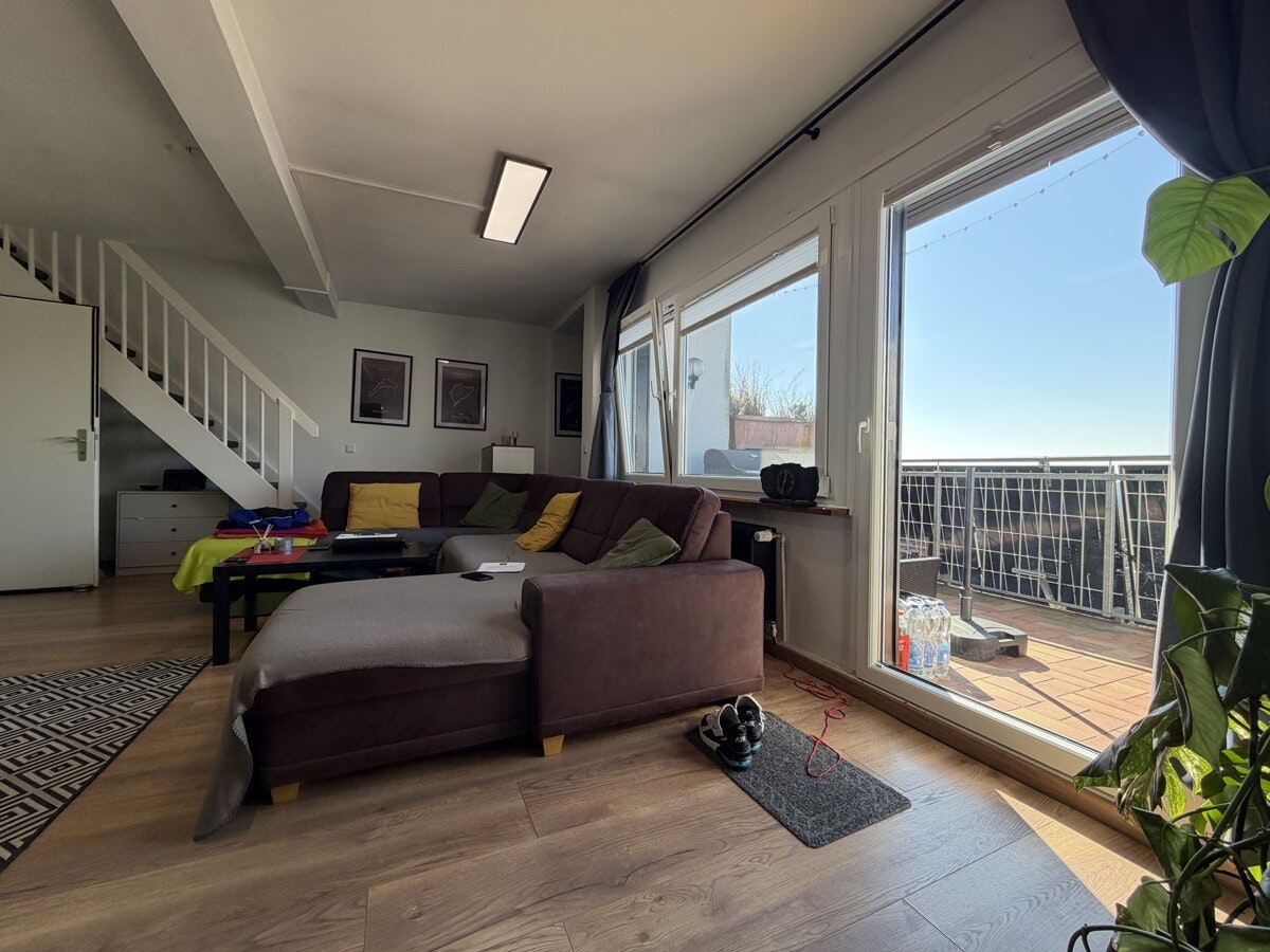 Das Herzstück dieser Maisonette ist der lichtdurchflutete Wohnbereich. Die offene Gestaltung und die Treppe, die elegant in die obere Ebene führt, verleihen der Wohnung einen modernen Loft-Charakter. Hier oben, über den Dingen, genießen Sie eine Privatsphäre, die man im klassischen Geschosswohnungsbau vergeblich sucht.