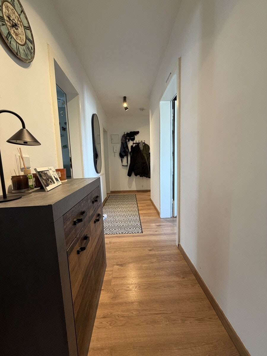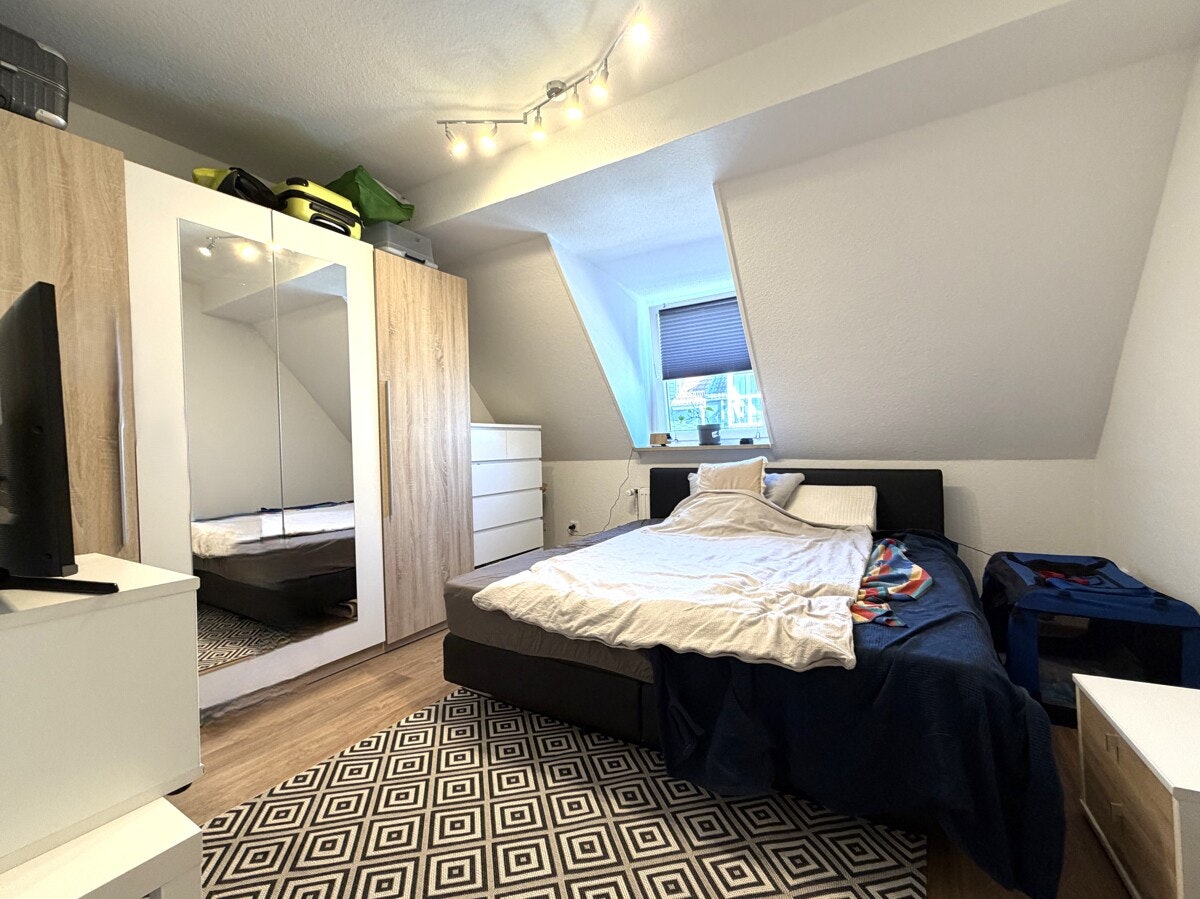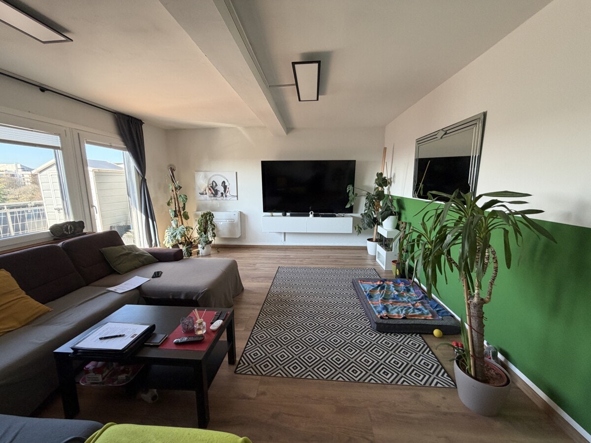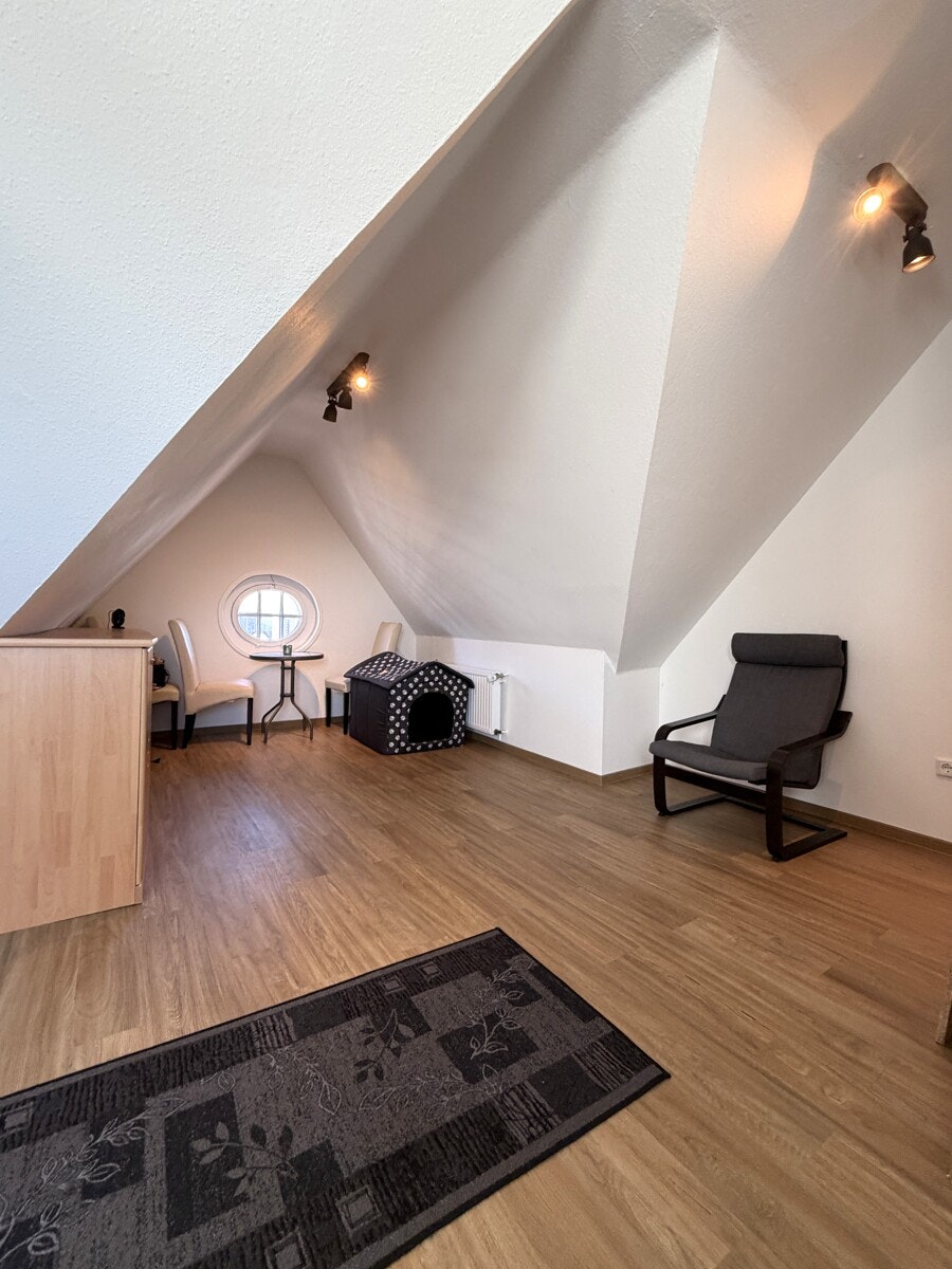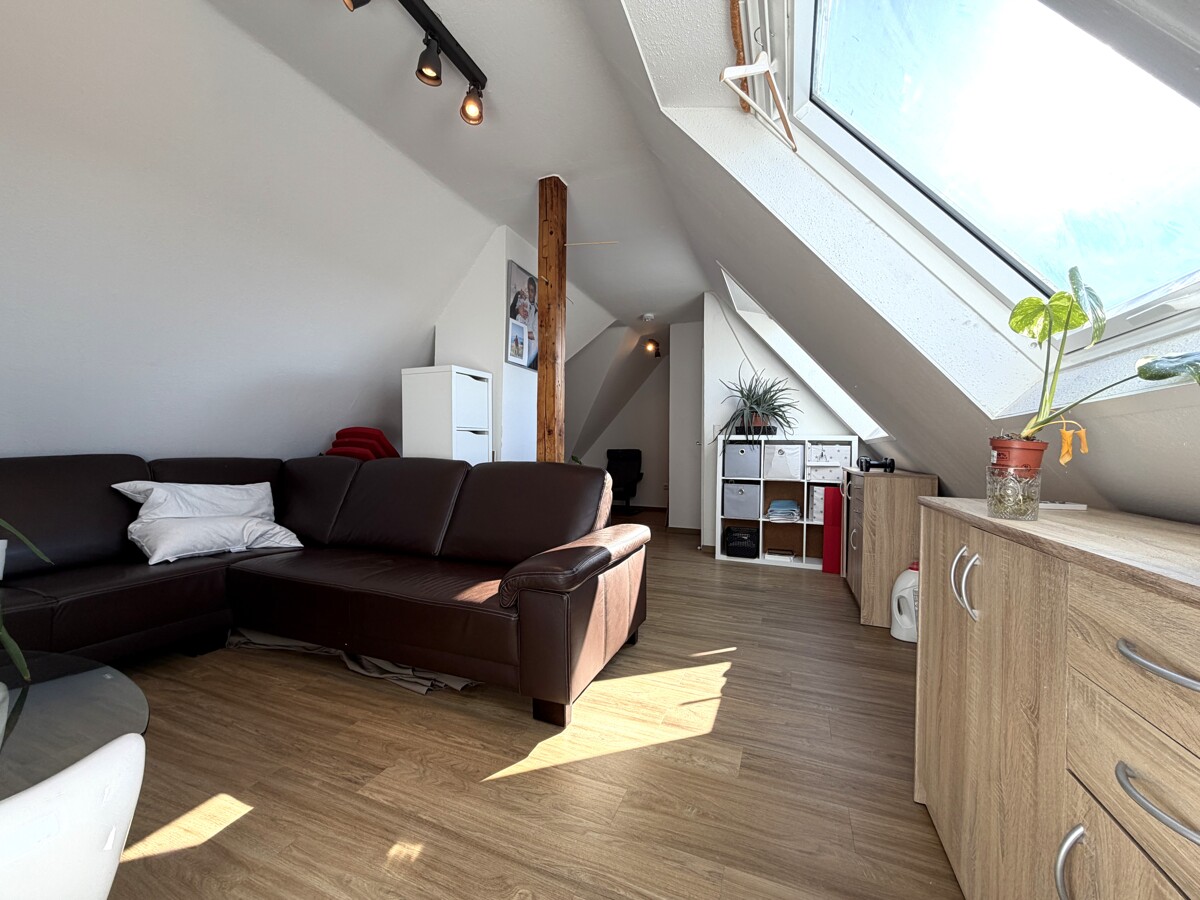 Das Herzstück dieser Maisonette ist der lichtdurchflutete Wohnbereich. Die offene Gestaltung und die Treppe, die elegant in die obere Ebene führt, verleihen der Wohnung einen modernen Loft-Charakter. Hier oben, über den Dingen, genießen Sie eine Privatsphäre, die man im klassischen Geschosswohnungsbau vergeblich sucht.