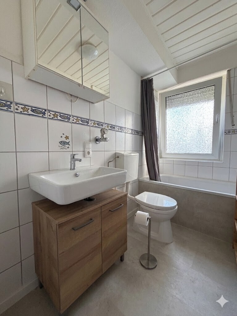 Das Badezimmer ist funktional gestaltet und verfügt über ein großes Fenster. Dies sorgt nicht nur für viel natürliches Licht beim Start in den Tag, sondern garantiert auch ein angenehmes Raumklima.