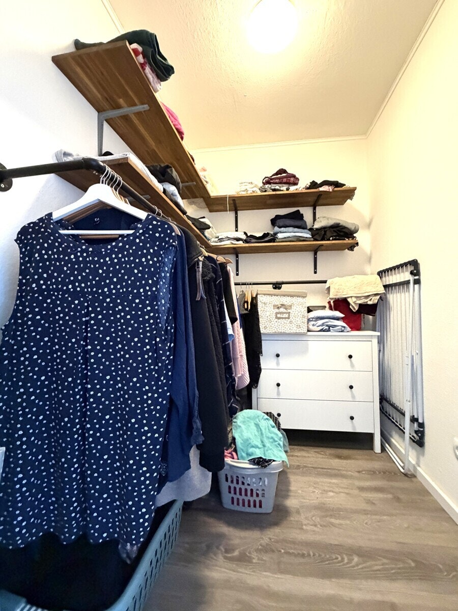 Das Schlafzimmer bietet nicht nur Ruhe für erholsame Nächte, sondern punktet mit einem echten Luxus-Feature: Einem separaten Ankleidezimmer. Vergessen Sie sperrige Kleiderschränke im Schlafbereich – hier bringen Sie Ihre Garderobe stilvoll und geordnet unter.