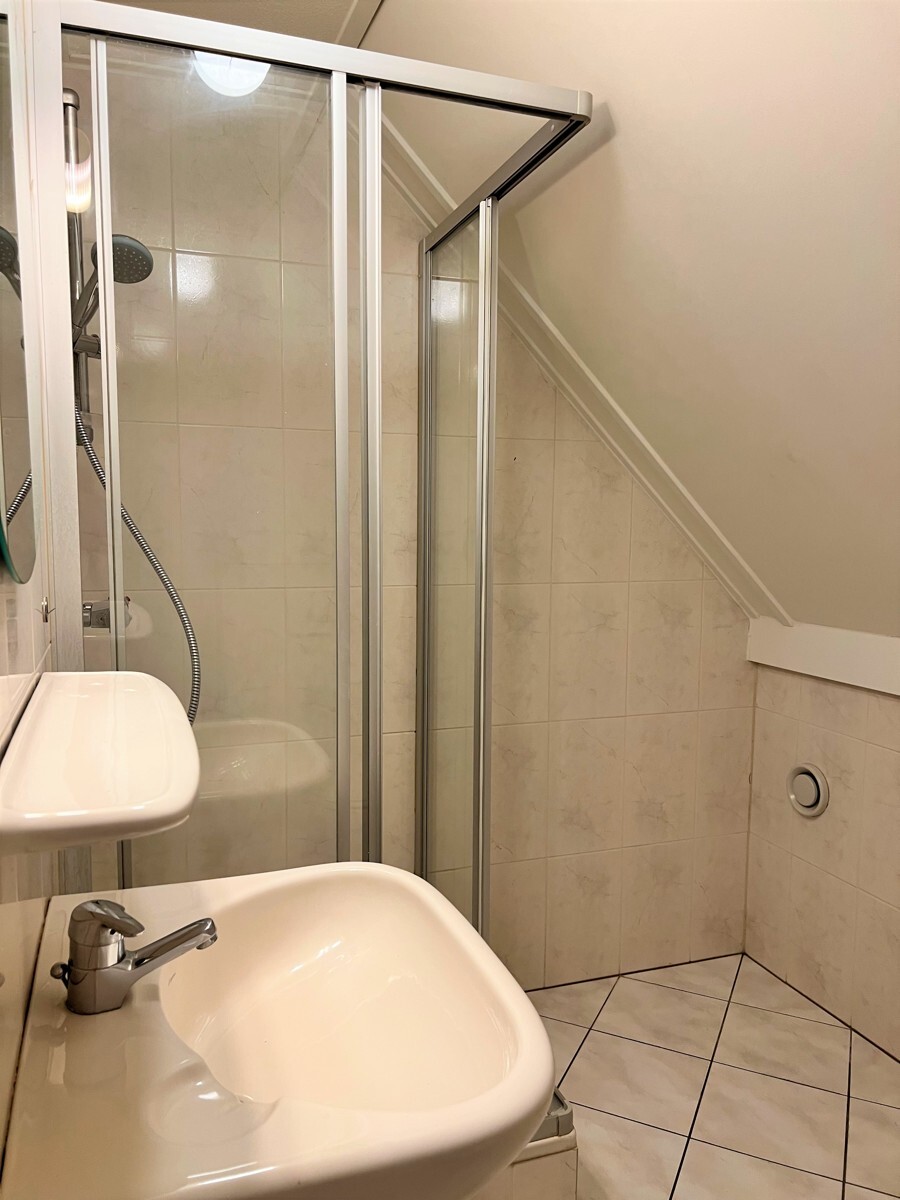 Badezimmer mit Dusche, Waschtisch und Toilette.